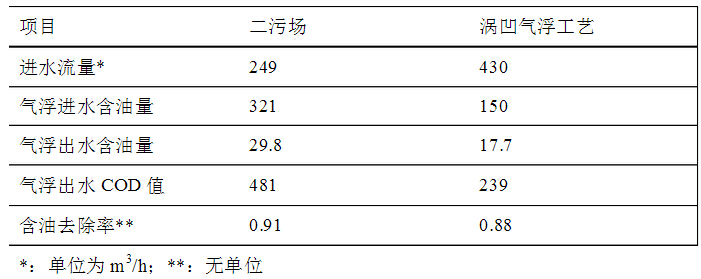 投入使用的渦凹氣浮機組運行良好,設(shè)備振動及噪音很小;產(chǎn)生的氣泡均勻細密;出渣細密,分布均勻;出水清澈,無明顯油花。下表為改造前后生產(chǎn)運行數(shù)據(jù)對比: