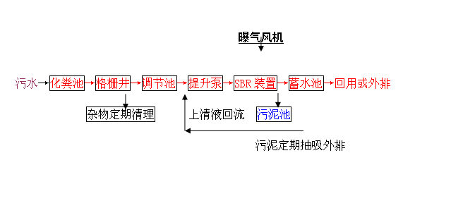 混合廢水經污水管流入集水井,經機械粗格柵去除污水中大顆粒固體物質后,進入調節池。再從調節池用泵提升至 SBR 池, SBR 排放的上清液出水經消毒處理自流入污水管道,進入管網。 SBR 所產生的剩余污泥經加藥凝聚,在污泥濃縮池內進一步濃縮,濃縮后的污泥泵入貯泥池,污泥定期外運。污泥濃縮池上清液及壓縮液返回集水井,進入生化系統再處理。