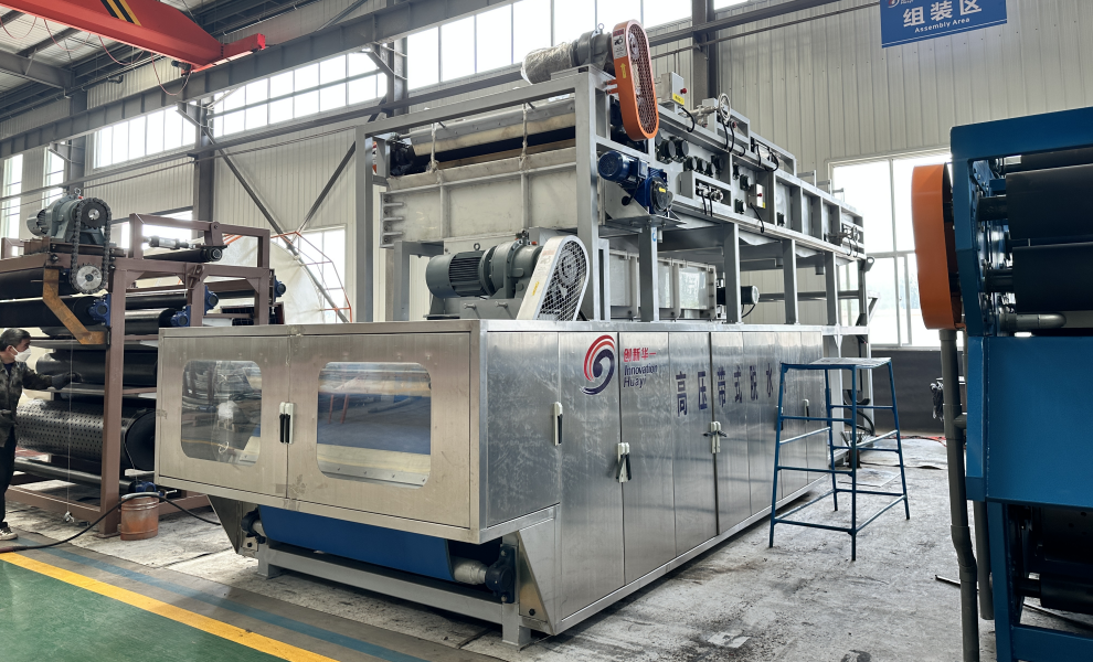 該設備是我公司在傳統帶式壓濾機基礎上,研發生產的全新一代污泥深度脫水機。設備增加了液壓裝置、污泥布料裝置,優化了調偏裝置、沖洗裝置和軸承座。新型超高壓帶式污泥脫水機脫水能力更強,可以在不添加或者少添加輔料的情況下,將污泥含水率降至60%以下。