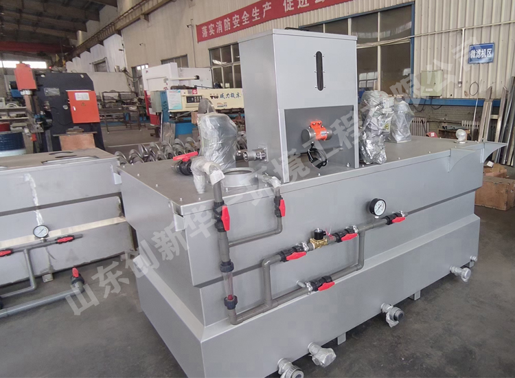 PAM全自動加藥裝置是一種粉狀固相藥劑通過變頻螺旋安系統設定參數及進水流量邏輯計算按比例投加,送入濕式混合器中。通過連續不斷的投加藥劑和水,配置設定濃度的藥劑。溶藥箱分為三段、預制溶解部分,和兩熟化老化部分,進入儲藥箱。設備每小時制備能力液體1000l/h,濃度0.05%-0.5%范圍可以調整。
